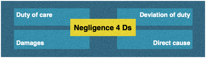 The 4 Ds of medical negligence are duty, dereliction, direct causation, and damages. All 4 Ds must be present for a claimant (person making the claim) to recover damages suffered from a negligent act. The burden of proof is on the claimant against the defendant (healthcare provider).